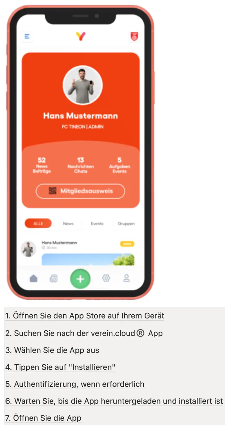 Im ersten Schritt laden Sie dann bitte aus Ihrem App Store (Apple oder Android) die App „Verein.cloud“ auf Ihr Mobiltelefon.
